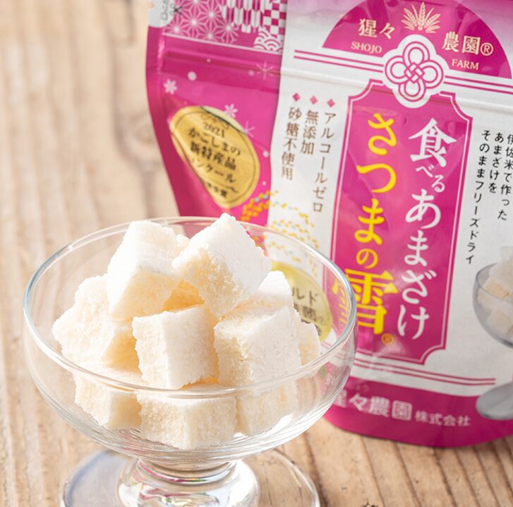 猩々農園がお米の生産から、麹まで丁寧に手作りしたあまざけをそのままフリーズドライにしました。